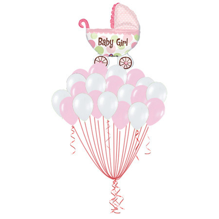Композиция "В честь рождения дочки" из 16 белых и розовых латексных шариков и 1 фольгированной фигуры в форме коляски для девочки.