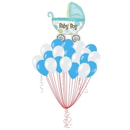 Композиция "В честь рождения сына" из 20 синих и белых латексных шариков и 1 фольгированной фигуры в форме коляски для мальчика.