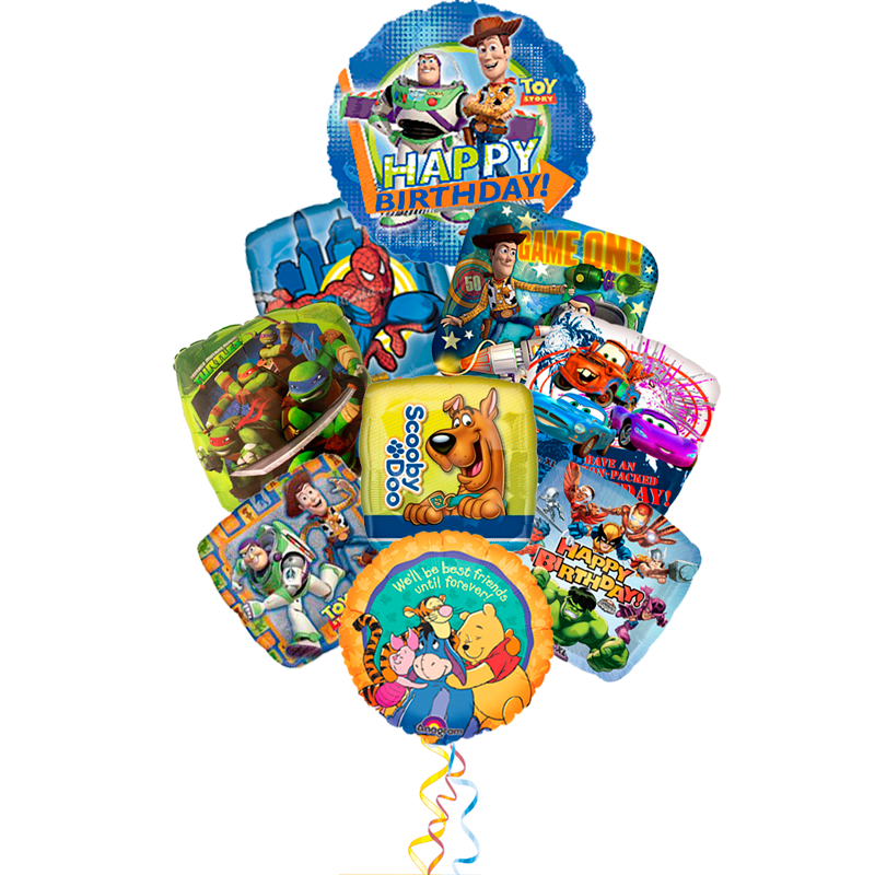 Букет "Герои мультфильмов", состоящий из 9 фольгированных шаров с изображением героев любимых мультфильмов, подарят море радости, станут невероятно красивым и очень приятным сюрпризом для Вашего ребенка!
