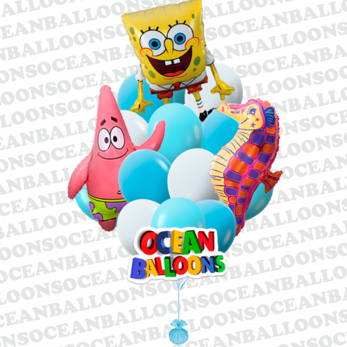 Тематический букет "Спанч Боб" из 20 разноцветных латексных шариков, 3 фольгированных фигур в виде Губки Боба, Патрик и Морской конек .